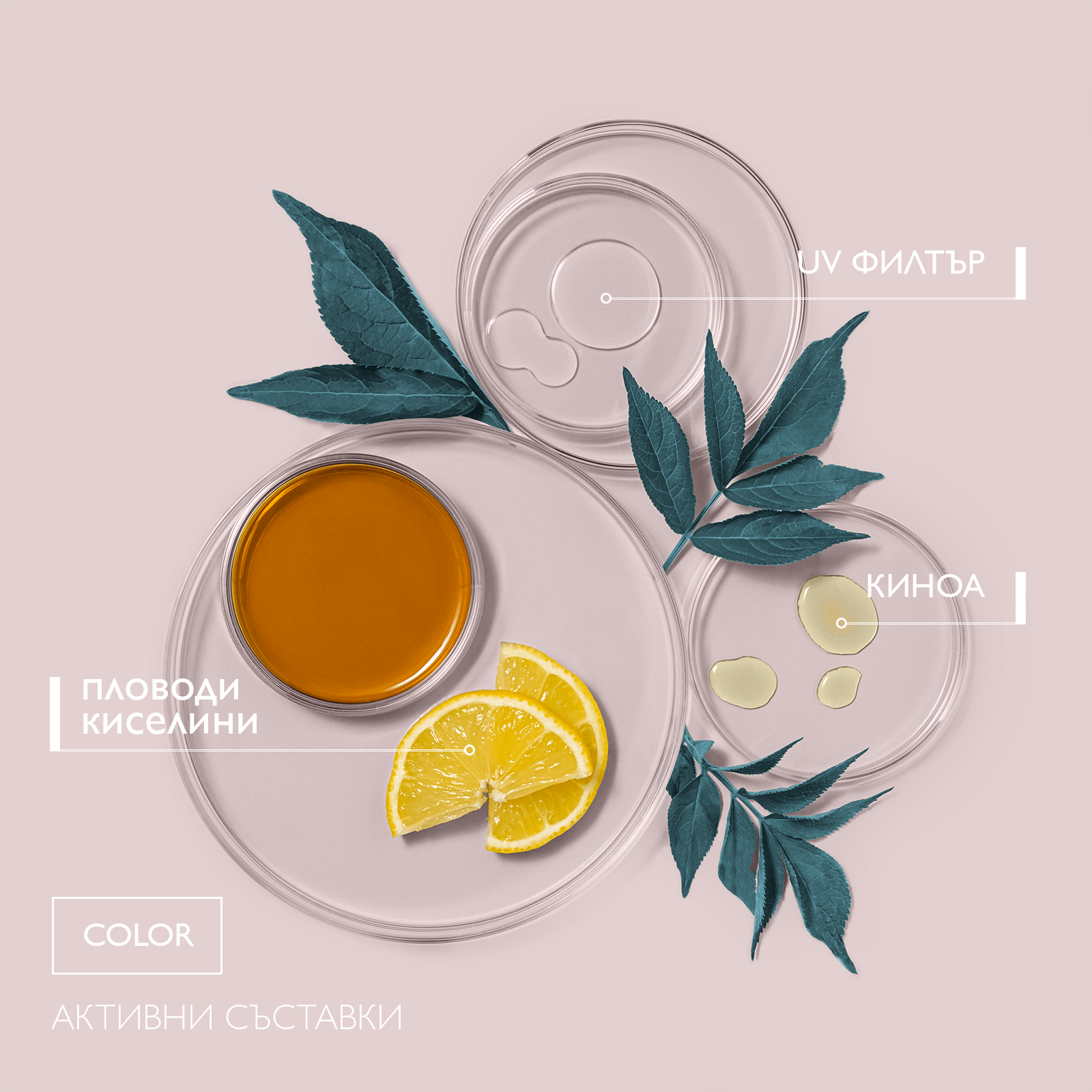За да разберем какво се изисква от продуктите за боядисана коса, трябва да разгледаме отблизо структурата на косата и процеса на боядисване. Кутикулата е външната защитна част на косъма, която представлява 6-8 слоя от плочковидни кератинови образувания. Кортексът - средният и най-голям слой, представлява нишковидни кератинови образувания, подреден в спирали. Именно в тях се съдържа и естественият пигмент на косата. Боята от своя страна се състои от две части - оцветяващ крем, съдържащ амоняк или друг алкален агент, заедно с багрила и окислителен крем, съдържащ пероксид. При смесването на двата компонента те взаимно се активират, като алкалният агент заедно с окислителния крем разтварят кутикулата на косъма и проникват в кортекса. Вследствие на това, окислителният крем избелва естествения цвят на косата и влиза в реакция с изкуствените багрила за получаване на желания нов цвят. Стабилността на изкуствения цвят зависи от вида на багрилата и тяхното количество. Съставките, заложени в колекцията, подпомагат процеса и защитават косата. Киноата благоприятства натрупването на багрилата и свързването им с косата. По този начин се затруднява отмиването и се насища цветът. Зеленият орех и UV защитата предпазват изкуствения цвят от увреждане вследствие на влиянието на околната среда. А плодовите киселини затварят кутикулата на косъма, предотвратяват натрупването на варовик и придават блясък.
