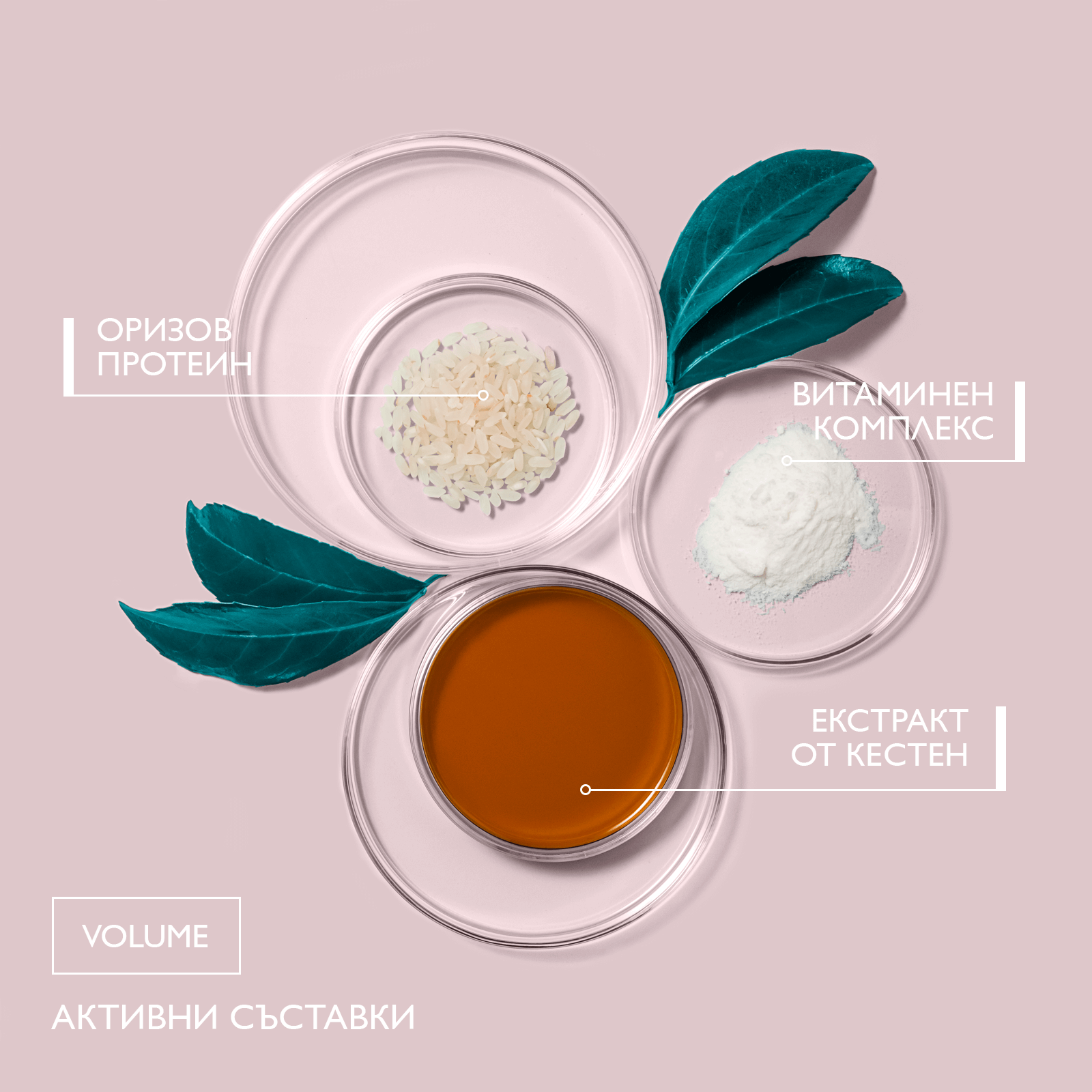 Осигурява видим обем още след първото нанасяне. С Оризови Протеини, Екстракт от Кестен и Витаминен Комплекс. Подхранва и подсилва косата, предпазва от накъсване и създава плътност.