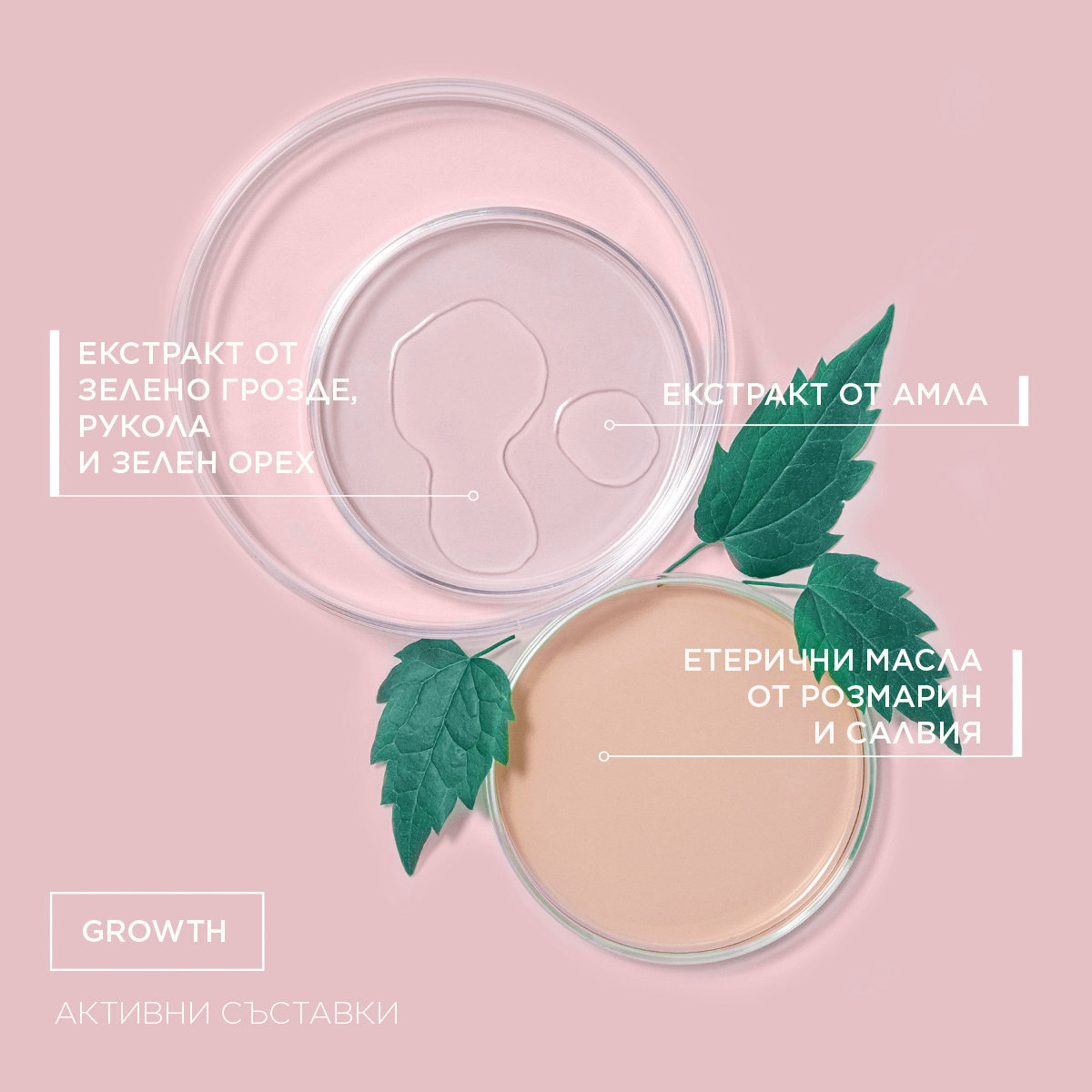Стволовите клетки от Зелено Грозде (Vitis Vinifera Fruit Meristem Cell Culture) стимулират микроциркулацията на скалпа и създават благоприятни условия за растеж на косата. Екстрактът от Зелен Орех съдържа полифеноли с антиоксидантно действие. Ефективно защитава косата и скалпа от вредните влияния на околната среда. Екстрактът от Рукола успокоява кожата на скалпа и повишава защитните ѝ функции.