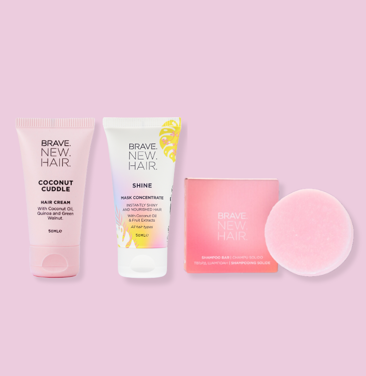 Специално подбрана комбинация от продукти на BRAVE. NEW. HAIR. за пълна грижа за коса, когато си на път.
