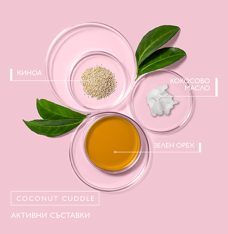 Блясъкът, податливостта ѝ на оформяне и цялостното здраве на косата са дълбоко повлияни от различните процедури, на които я подлагаме всеки ден. Използването на сешоар или четки за коса, дори и околната среда могат да увредят кутикулата на косъма и да увеличат сухотата, матирането и увреждането като цяло. Кремът за коса COCONUT CUDDLE е подхранващ продукт без отмиване, който напълно защитава косата и повишава нейната хидратация. Нашата формула от мощни активни съставки действа върху кутикулата, като я затваря, заключва влагата вътре в косъма и предпазва от увреждане дори при топлинна обработка до 220 C. Кокосовото масло възстановява и допълва естествения защитен липиден слой на косъма, докато киноата подобрява дефинирането на къдриците и осигурява блясък. Зеленият орех действа като допълнителна защита срещу увреждане, предизвикано от ултравиолетовите лъчи. За подхранена, красива коса и по-малко увреждане.