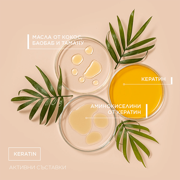 - Възстановява и наваксва естествения протеин на косата.