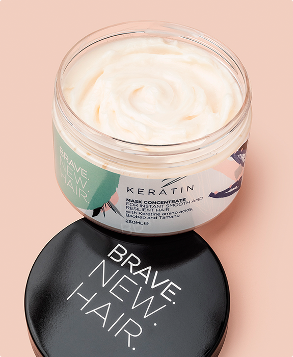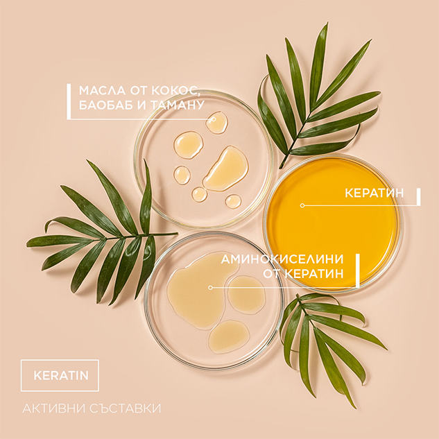 Активна маска за коса, богата на кератин и органични масла от Кокос, Таману и Баобаб. Изглажда, заздравява и дисциплинира косата още след първото нанасяне. Наваксва и попълва естествения протеин на косата. Интензивно подхранва. За гладка, блестяща и силна коса.